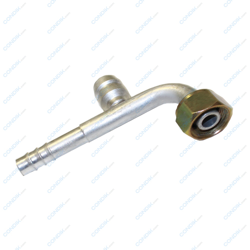 Фітінг № 8 90° із сервісним портом та накидною гайкою — це сполучний елемент, призначений для з’єднання шлангів у системі автокондиціонера. Виготовляється з алюмінію, що гарантує довготривалу та надійну експлуатацію. Фітінг 90° із сервісним портом та накидною гайкою №8 під шланг 10 мм приєднується за допомогою оливо- та бензостійкого кільця ущільнювача (сальника) та гарантує герметичне з’єднання, стійке до високого тиск, перепадів температур та вібрацій.